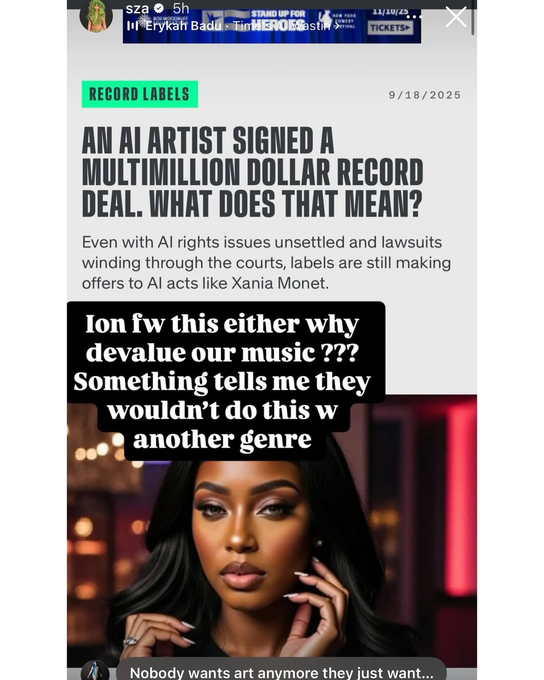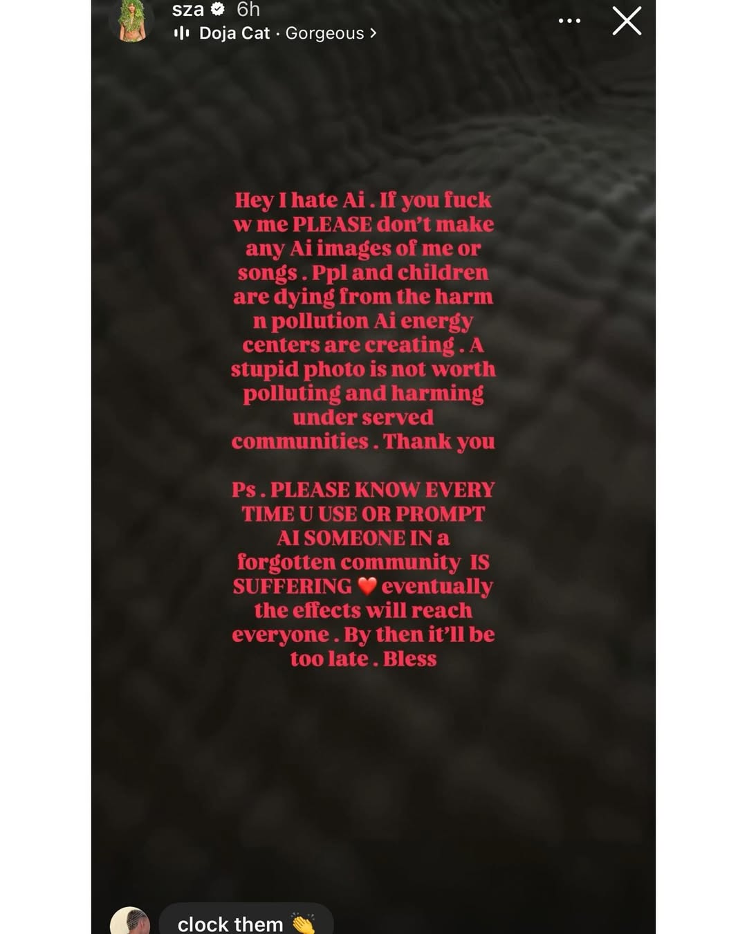 “I hate AI,” SZA wrote. “Please don’t make any AI images of me or songs. Ppl and children are dying from the harm n pollution AI energy centers are creating.”