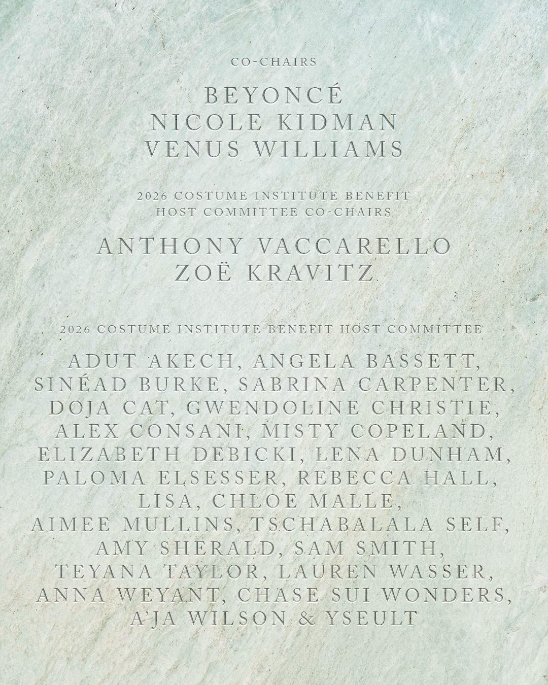Beyoncé isn’t taking on the steps alone. She’ll be sharing co-chair duties with a diverse and heavy-hitting lineup: